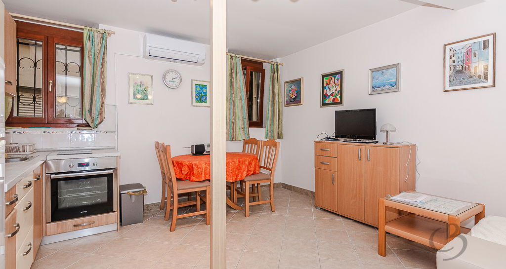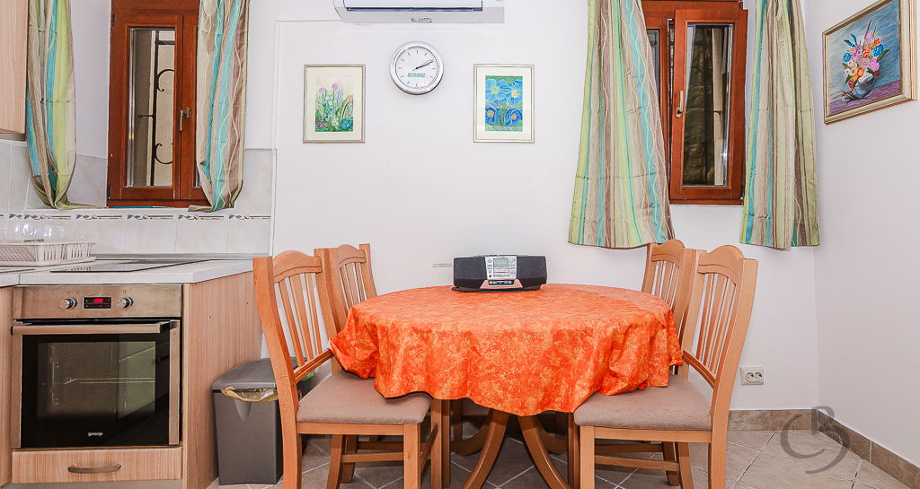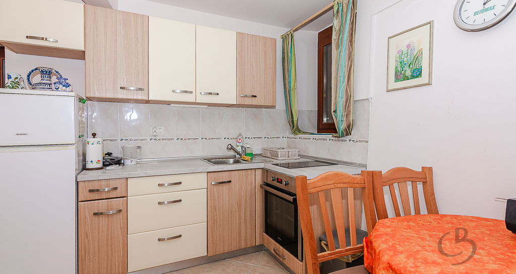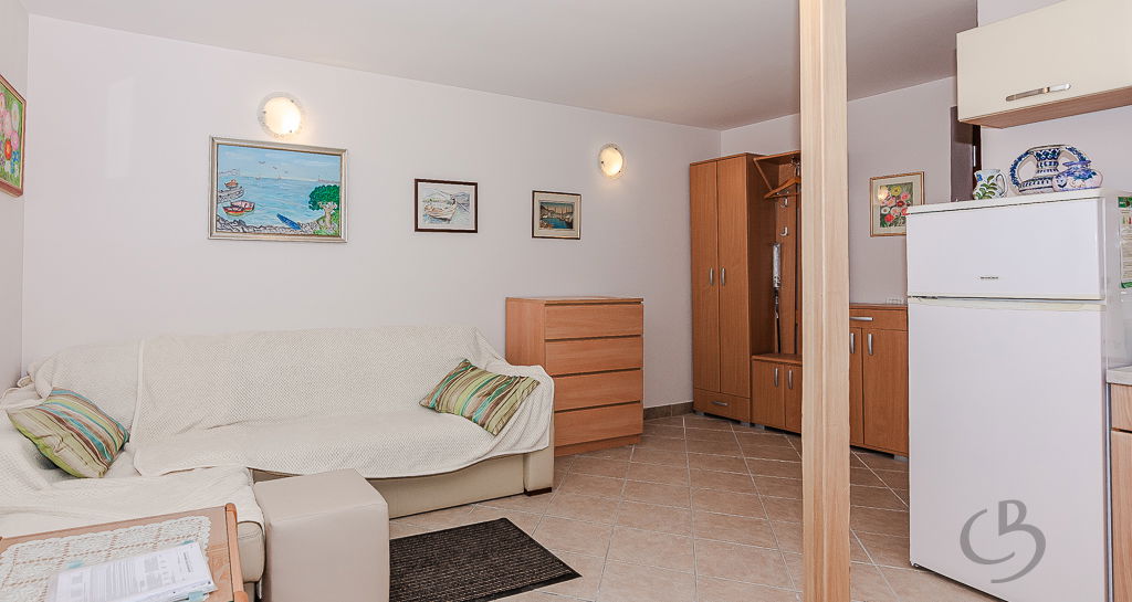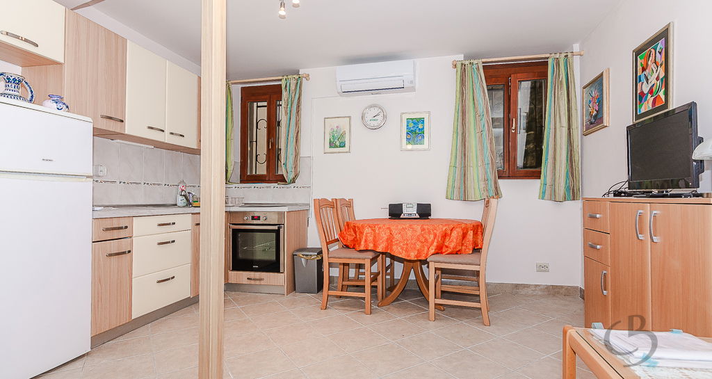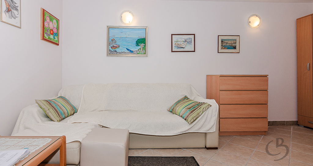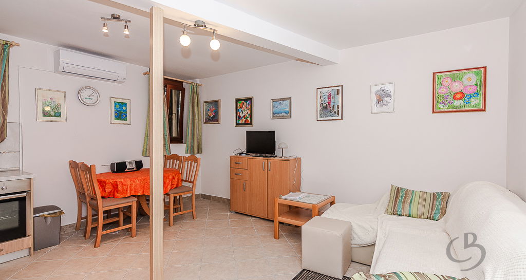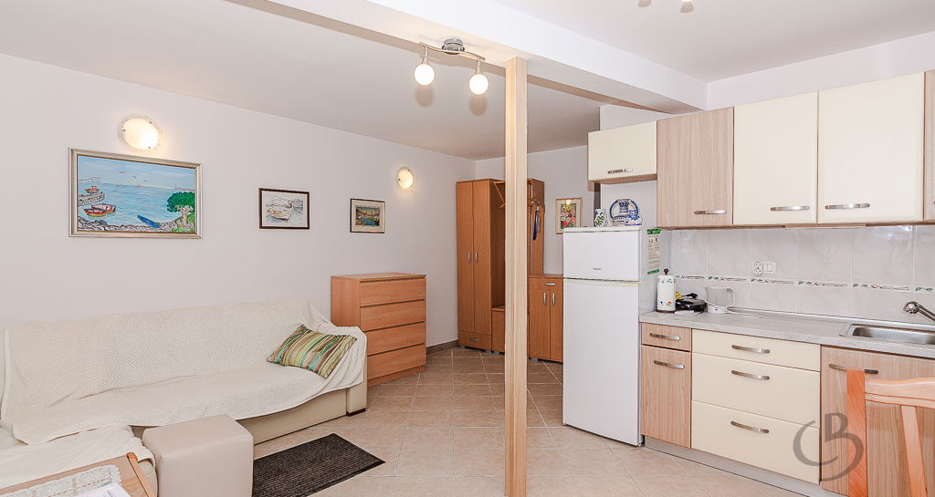 The apartment consists of a kitchen with a dining area, a sofa bed, several small storage cabinets, and a bathroom. The apartment is equipped with air conditioning for both heating and cooling, ensuring a comfortable living environment year-round. An additional advantage of this property is the spacious cellar (6.3 m²), providing extra storage space for bicycles and other items. The apartment is offered fully furnished.