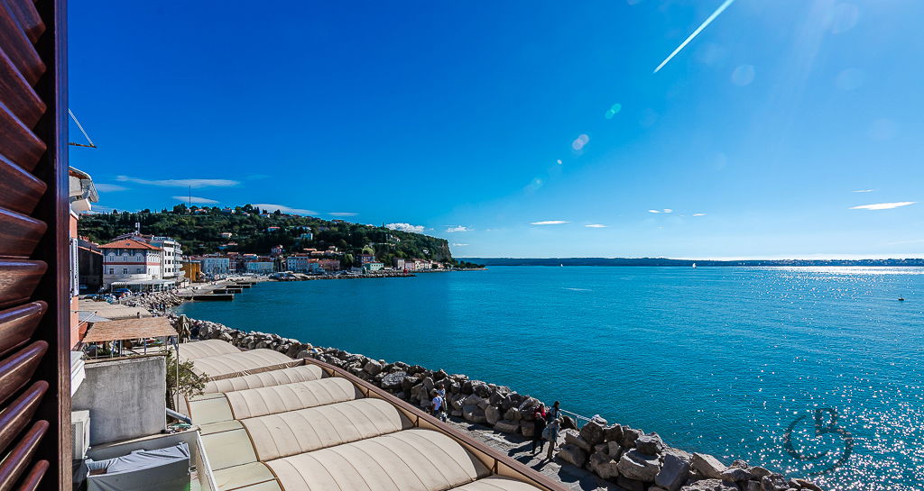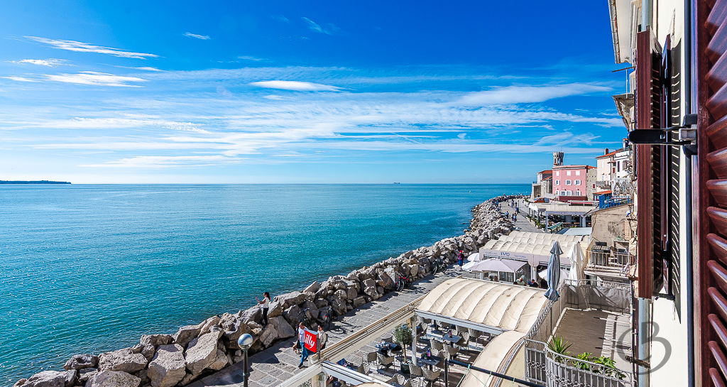 Lokacija na piranski Punti sodi med najbolj zaželene v Piranu – prva linija ob morju, približno 50 m od plaže. Iz stanovanja se odpira čudovit, odprt pogled na piranski zaliv: levo proti Bernardinu in Portorožu, desno vse do Italije. Historično mestno jedro Pirana, s Prvomajskim trgom, restavracijami, kavarnami in trgovinami, je dosegljivo v le nekaj minutah hoje. Kombinacija prve vrste ob morju in bližine vse infrastrukture omogoča udobno bivanje brez avtomobila ter vrhunski potencial pri oddaji.