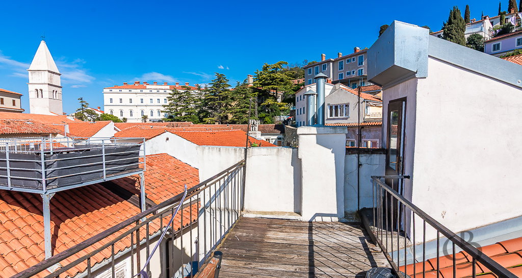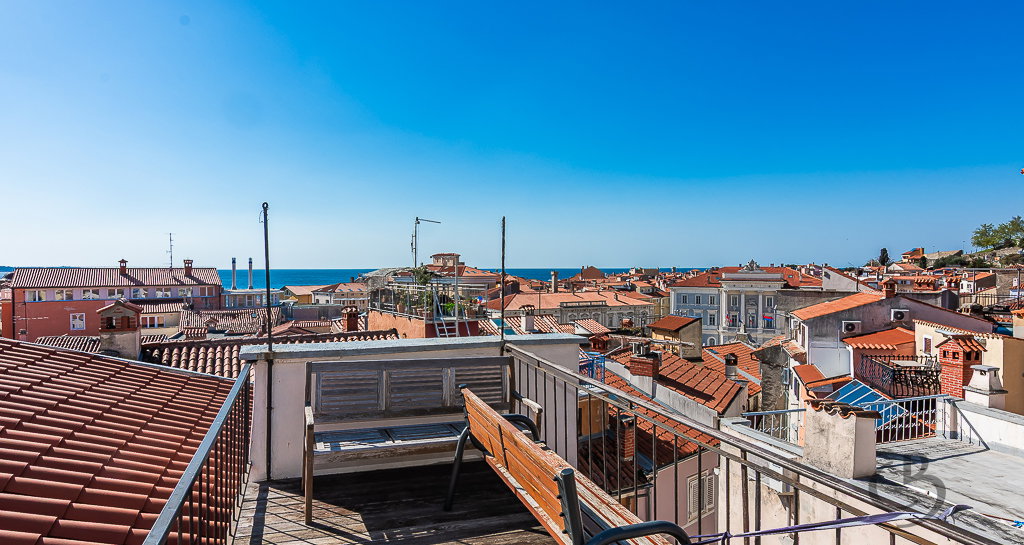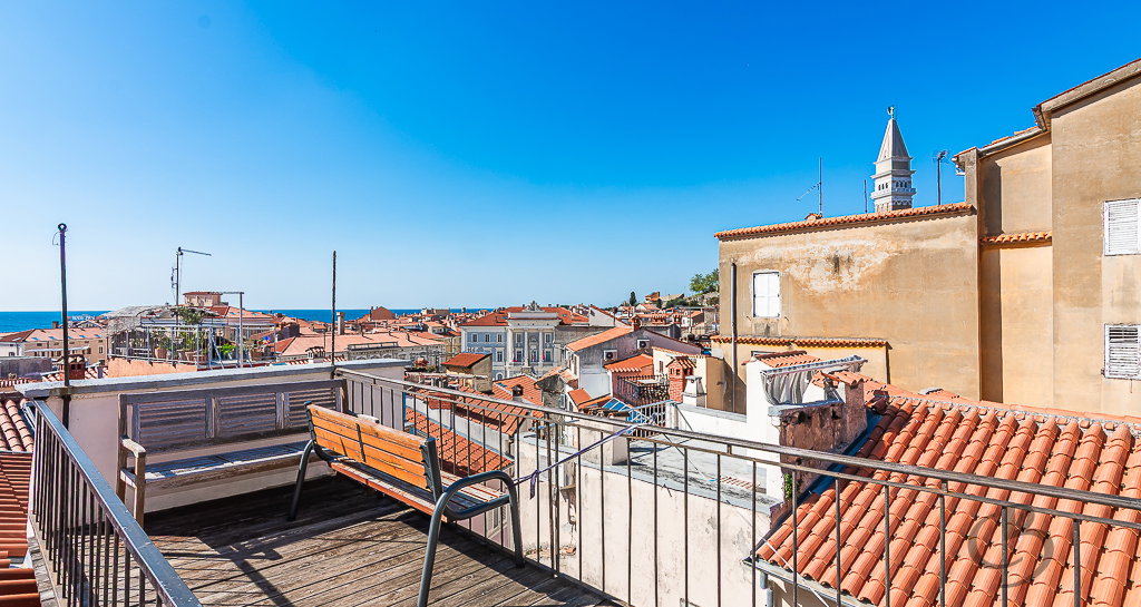Posebna vrednost nepremičnine je strešna terasa (10,60 m²), ki nudi izjemen, odprt pogled na slikovite strehe Pirana, ozke ulice starega mestnega jedra in morje – prava mediteranska kulisa.